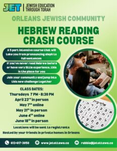 Hebrew Reading Crash Course (Orleans Jewish Community) by Rabbi Altonaga | Apr 20, 2026 | 0 comments Submit a Comment Cancel replyYour email address will not be published. Required fields are marked *Comment * Name * Email * Website Δ